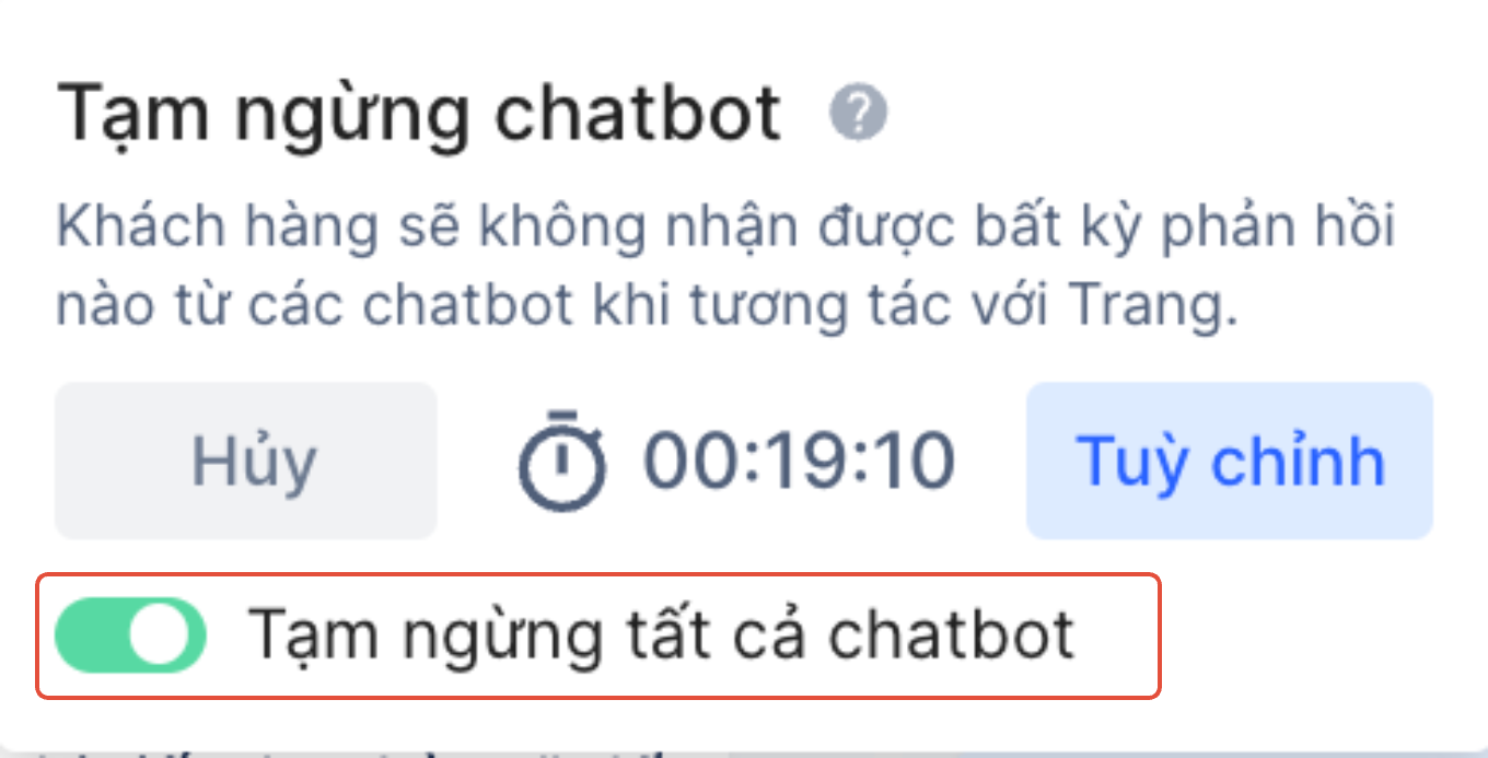 Ví dụ: Thời gian nhân viên cài đặt tạm ngừng chatbot là 30 phút nhưng thời gian đếm ngược đến hiện tại là còn 27 phút → nhân viên tăng thời gian tạm ngừng chatbot thêm 10 phút → Thời gian đếm ngược được tính từ đầu lại sẽ là 40 phút (30 phút ban đầu đã chọn + 10 phút vừa tăng)