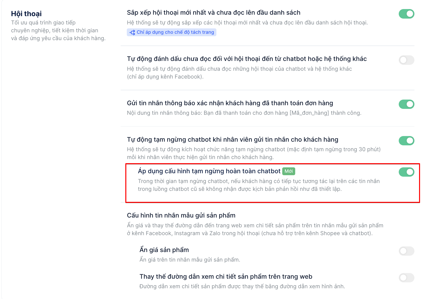 - Bật tính năng tạm ngừng chatbot