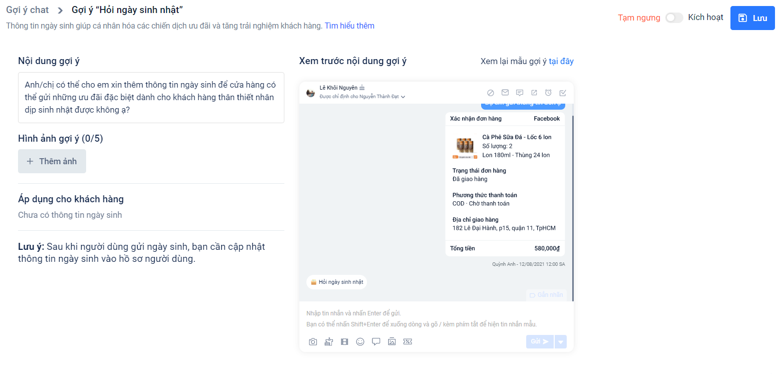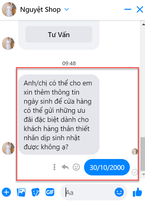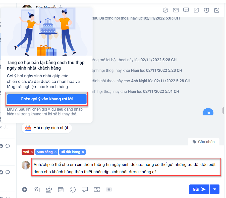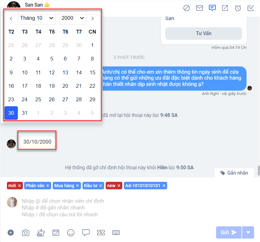 - Trong trường hợp nhân viên đã gửi kịch bản gợi ý hỏi ngày sinh, nếu khách hàng chưa cung cấp thông tin thì vào 30 ngày sau nút gợi ý hỏi ngày sinh mới được hiển thị lại.