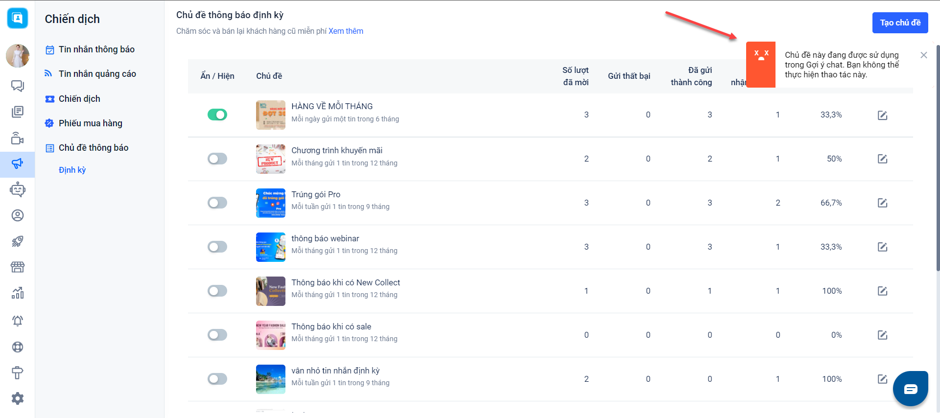 - Chủ đề thông báo định kỳ khi được chọn trong công cụ Gợi ý chat sẽ không thể tắt kích hoạt tại công cụ Chiến dịch → chủ đề thông báo định kỳ: