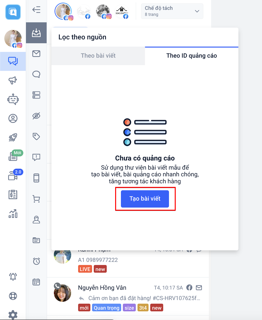 - Đối với quảng cáo, chỉ khi khách hàngnhấn Gửi tin nhắn trên quảng cáo thì bộ lọc mới hiển thị tên + Ads ID của bài quảng cáo đó.