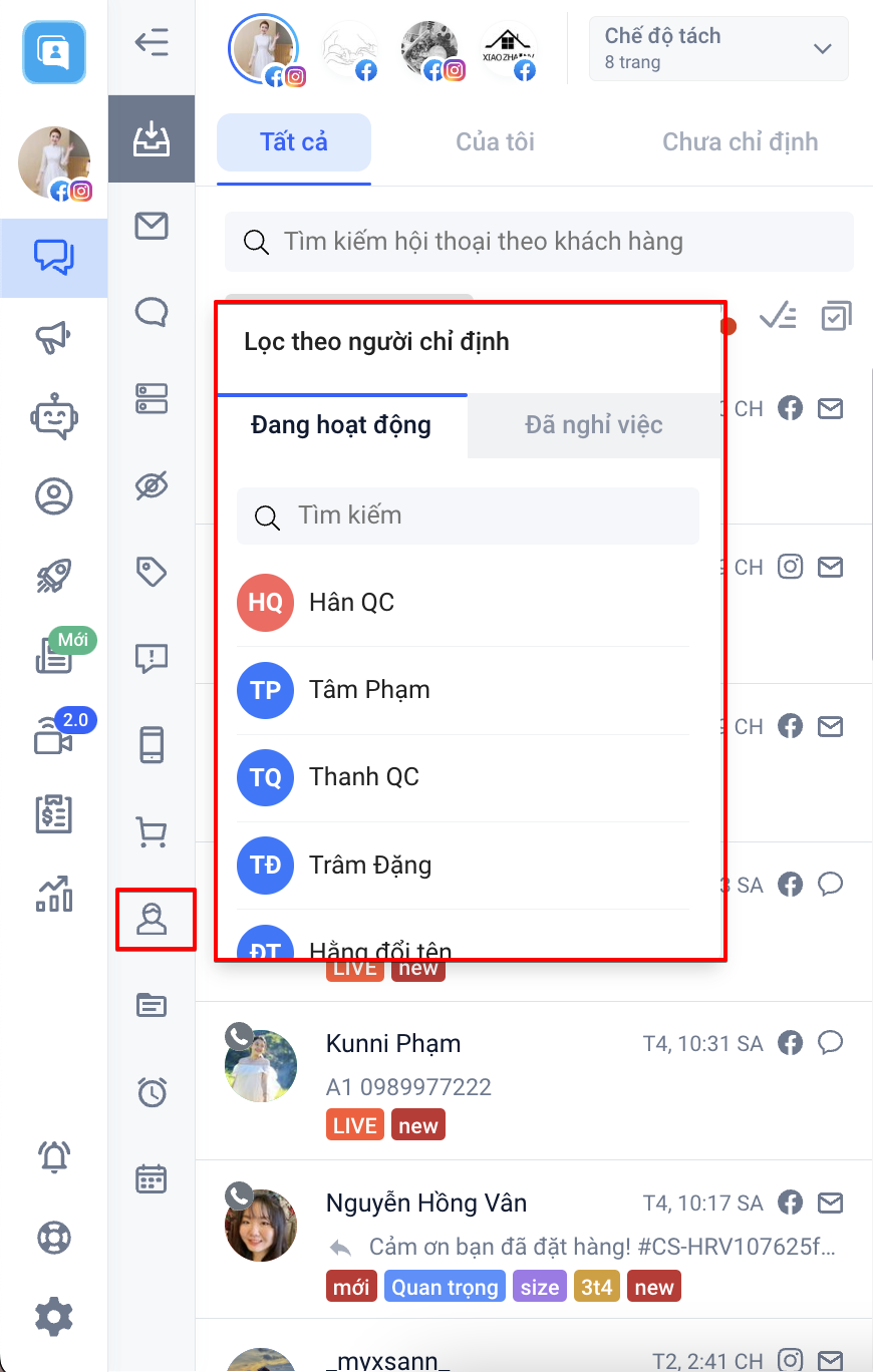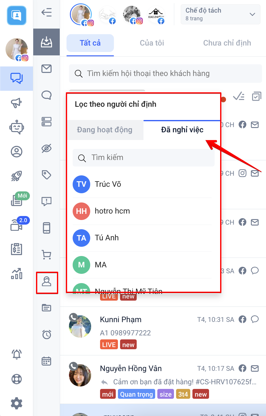 Lọc theo người chỉ định: Bộ lọc này sẽ có 2 mục lọc theo tài khoản nhân viên đang hoạt động hoặc đã nghỉ việc