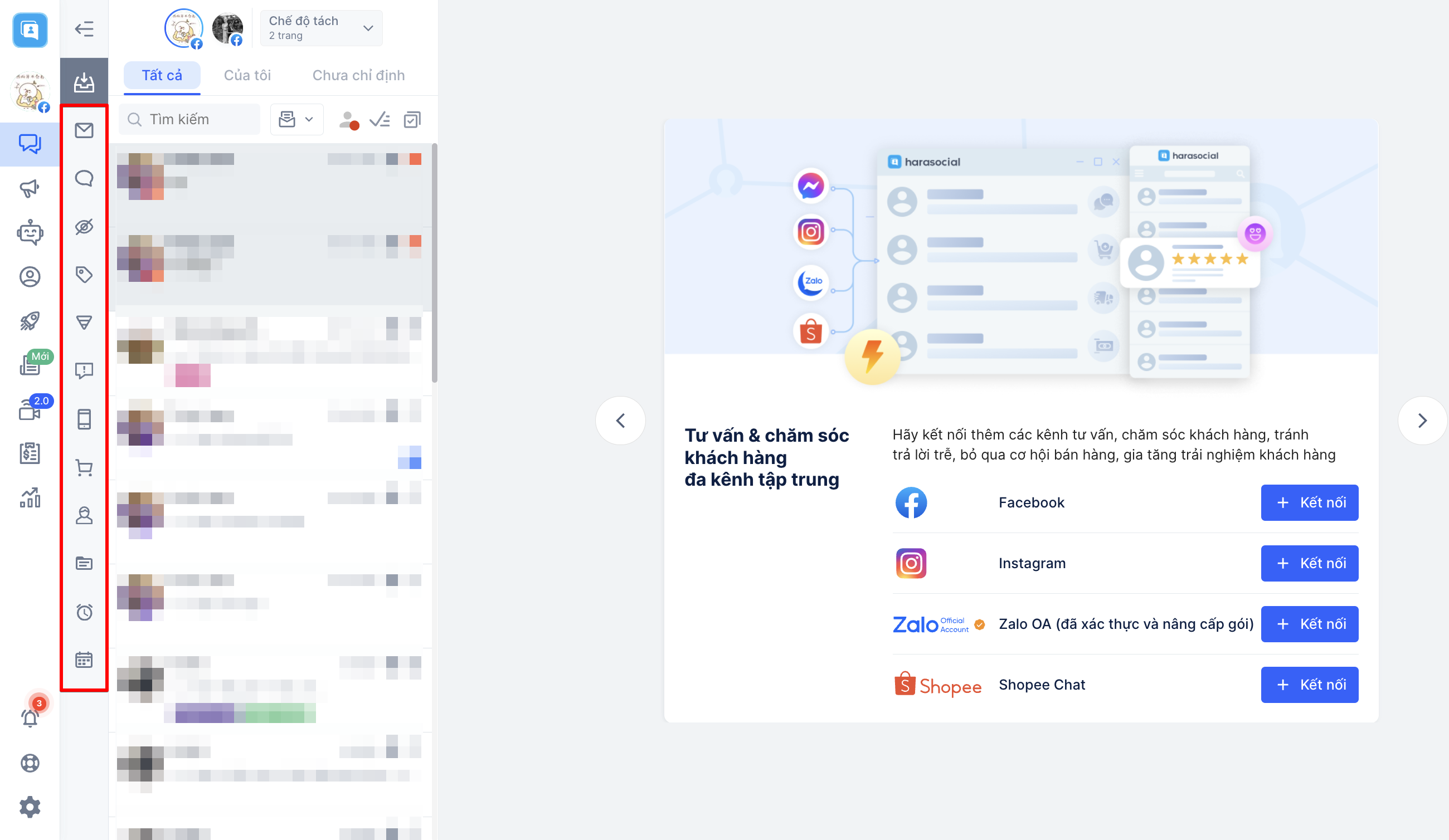 Bạn có thể xem được bộ lọc bằng cách: truy cập HaraSocial → Hội thoại → Bộ lọc sẽ được hiển thị phía bên trái phần danh sách hội thoại