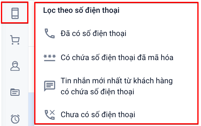 - Lọctin nhắn mới nhất từ khách hàng có chứa số điện thoại: lọc các hội thoại có tin nhắn mới nhất từ khách hàng có chứa số điện thoại, không bao gồm số điện thoại mã hóa.