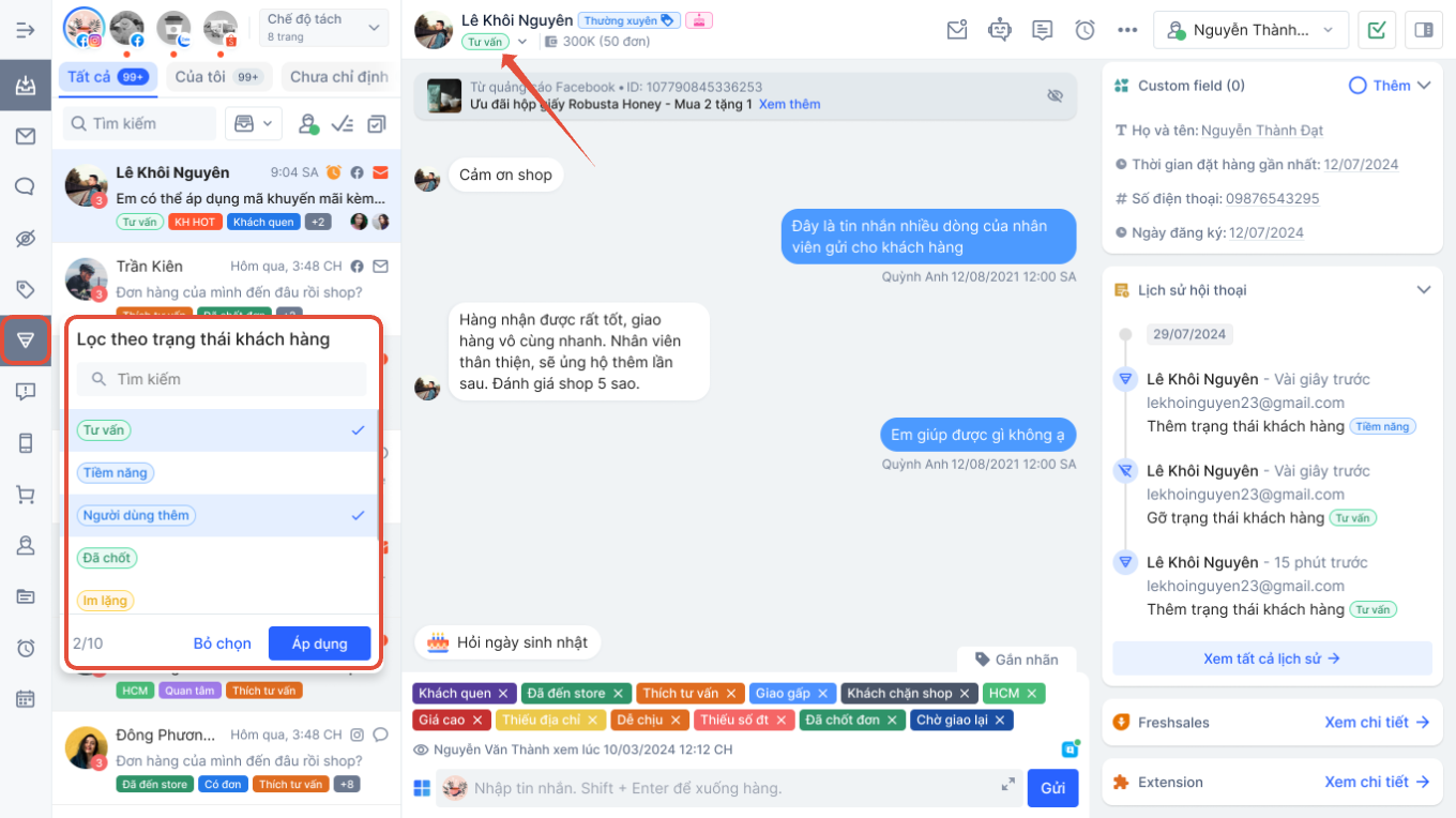 - Lọc theotrạng thái khách hàng: bạn có thể lọc dựa vào trạng thái theo từng giai đoạn mà bạn đang gắn cho khách hàng. Xem thêm công cụ phễu trạng thái khách hàngtại đây.