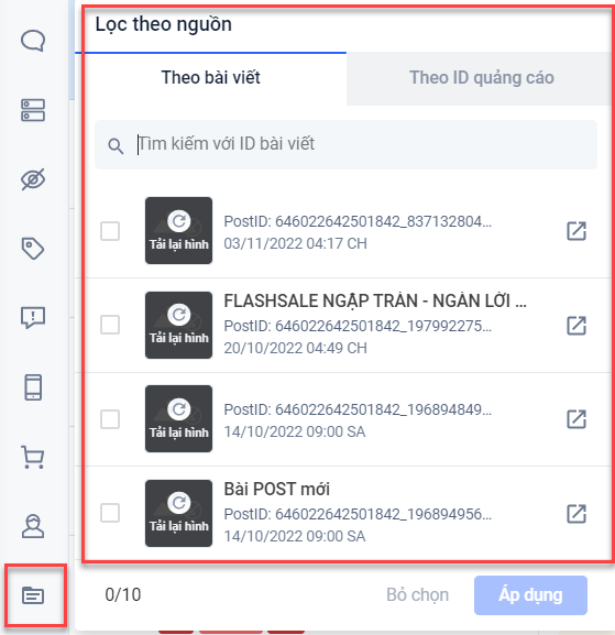 - Lọc theo nguồn: bao gồm 2 bộ lọc (theo bài viết - theo ID quảng cáo)