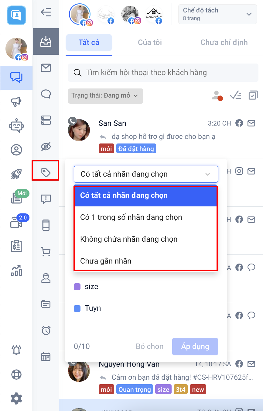 - Lọc theo nhãn: Lọc các hội thoại được gắn nhãn. Với bộ lọc này sẽ có thêm 4 điều kiện: