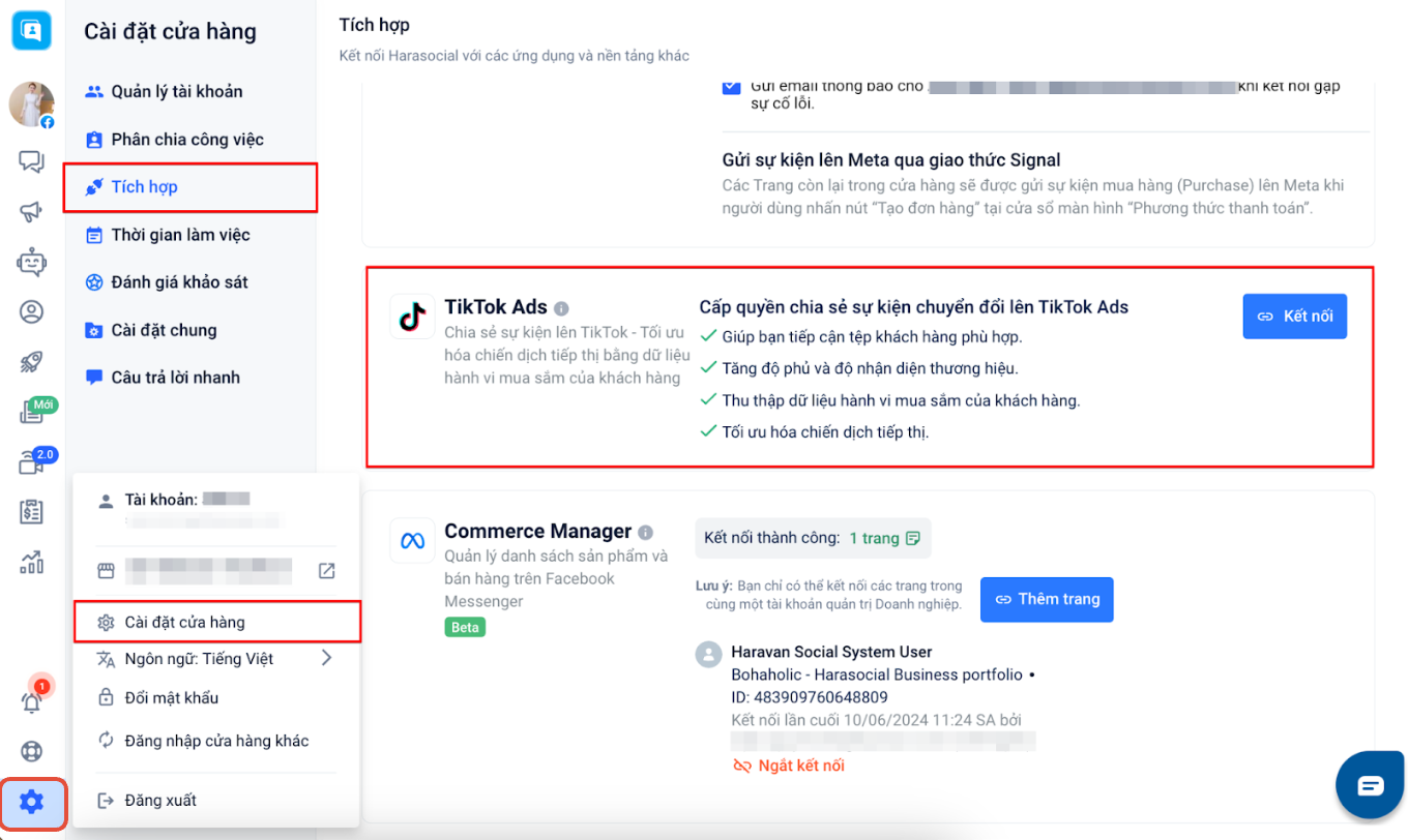- Yêu cầu bật và kết nối TikTok Ads tại menu Tài khoản → Cài đặt cửa hàng→Tích hợp: TikTok Ads.Xem chi tiết hướng dẫntại đây.