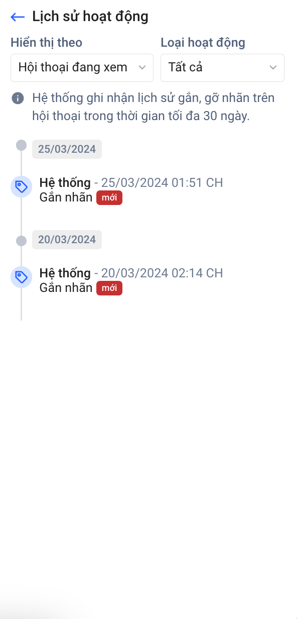 Lưu ý: Hệ thống chỉ ghi nhận lịch sử gắn - gỡ nhãn trên hội thoại trong thời gian tối đa 30 ngày. Đối với lịch sử chặn - bỏ chặn khách hàng sẽ được lưu vĩnh viễn.