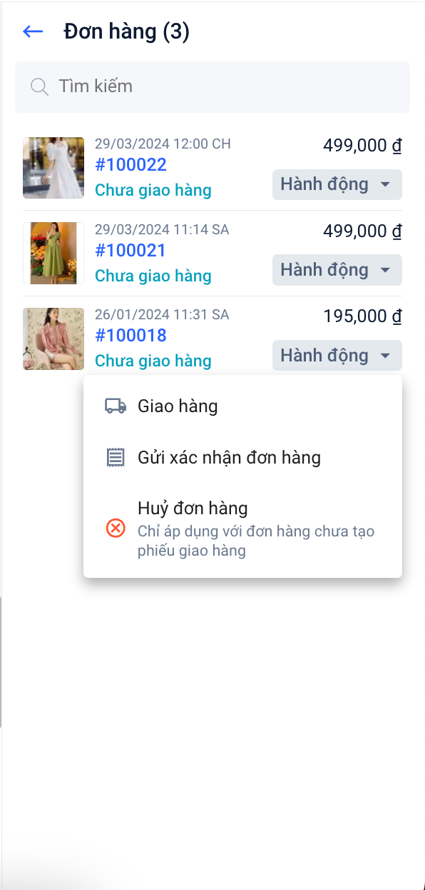 - Nút hành động đi kèm với các thao tác bao gồm: Giao hàng, Gửi xác nhận đơn hàng, Hủy đơn hàng.