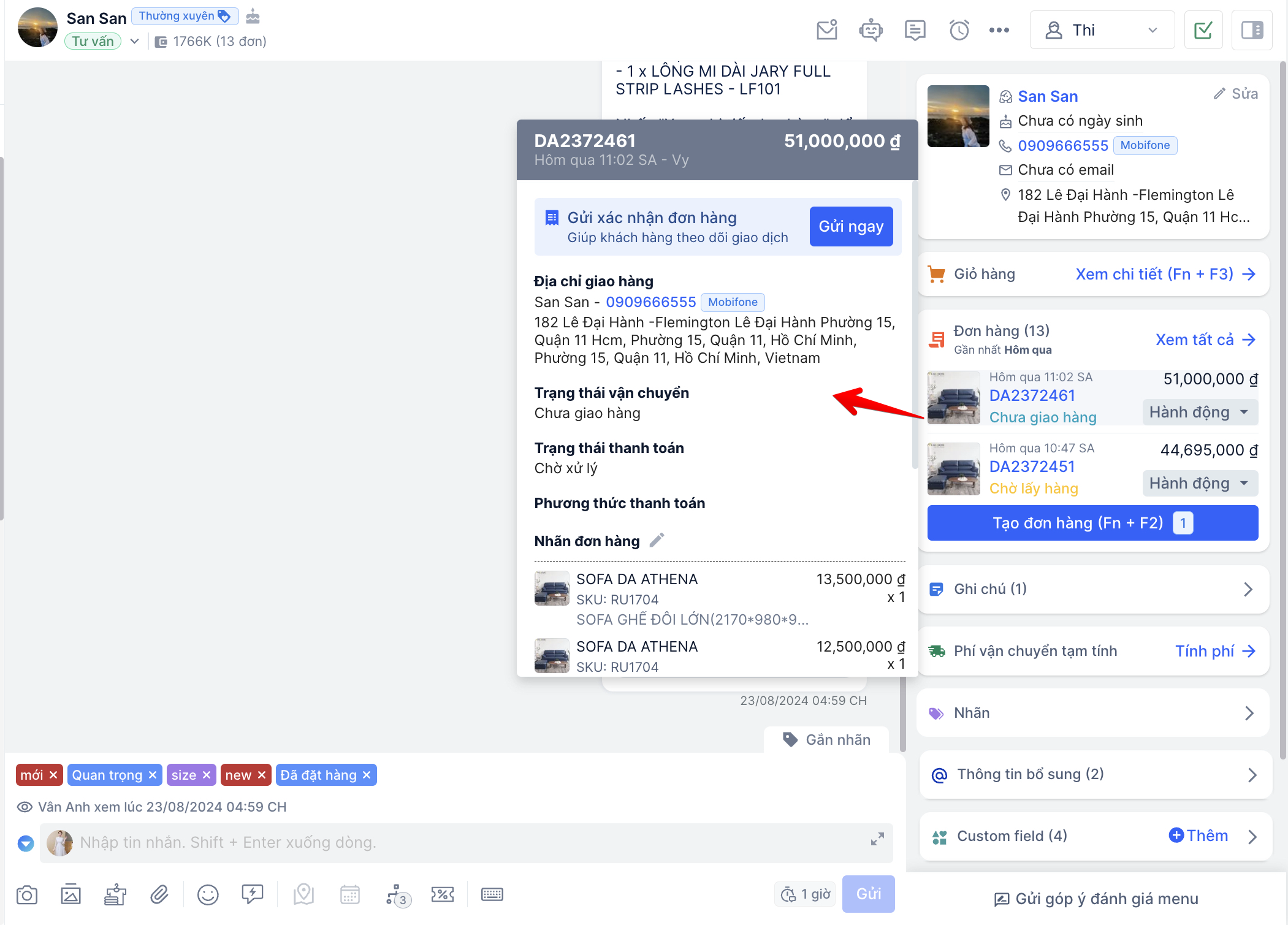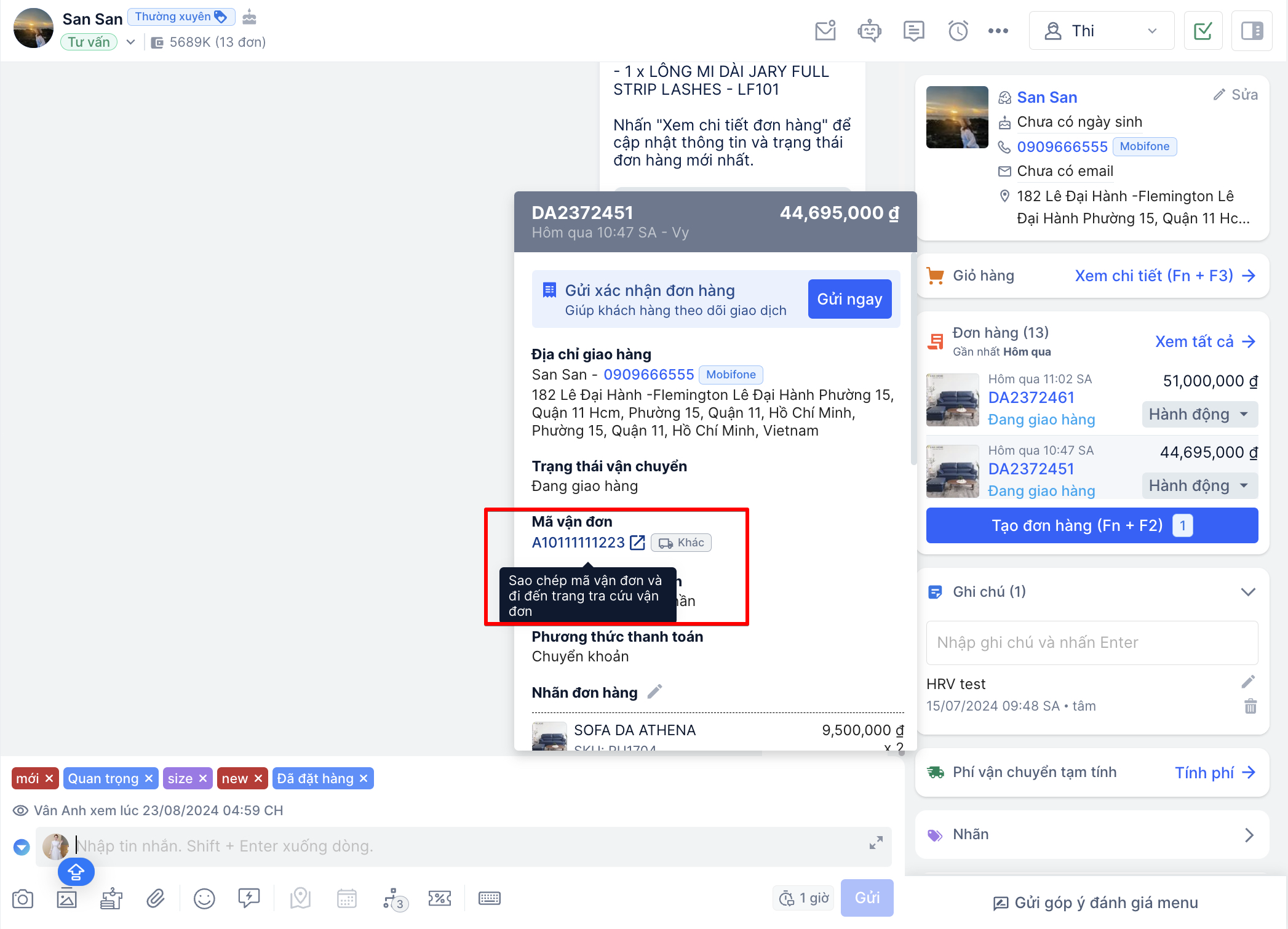 - Khi nhấp vào mã đơn hàng sẽ được dẫn đến trang xử lý đơn hàng của Omni để bạn có thể xử lý đơn hàng. Bên cạnh đó còn xem được trạng thái đơn hàng để tạo phản hồi cho khách ngay trong khi chat bằng cách đưa chuột vào hình ảnh sản phẩm trong hóa đơn.