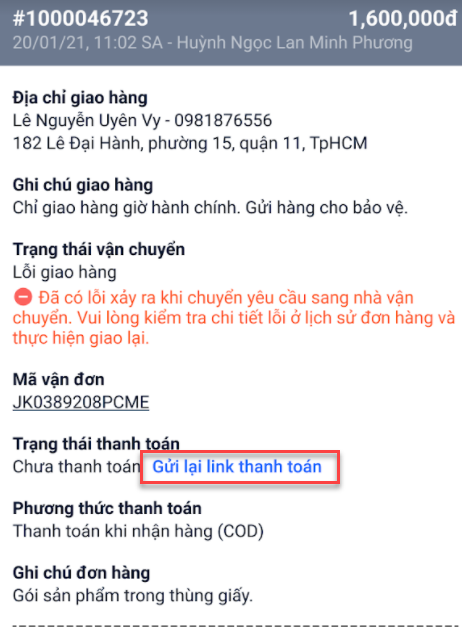 - Trong trường hợp, khách hàng chưa nhận được link thanh toán, bạn có thể gửi link thanh toán bằng cách nhấp vào “Gửi lại link thành toán” tại đây, người dùng có thể lựa chọn phương thức thanh toán khác không phải là “Khác”, “COD”, “Ngân hàng”.