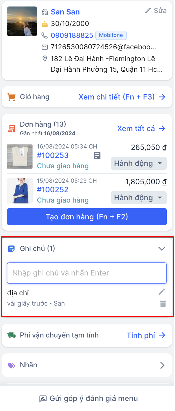 Tại đây bạn có thể ghi chú lại các thông tin cần thiết về khách hàng.