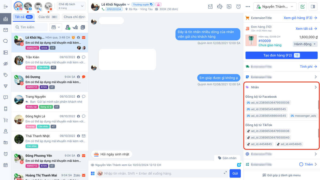 Tại mục này hệ thống sẽ tổng hợp các ID đến từ các quảng cáo mà khách hàng đã click vào từ Facebook và Tiktok. Hỗ trợ cho nhân viên có thể đánh giá được các hiệu quả của các quảng cáo.
