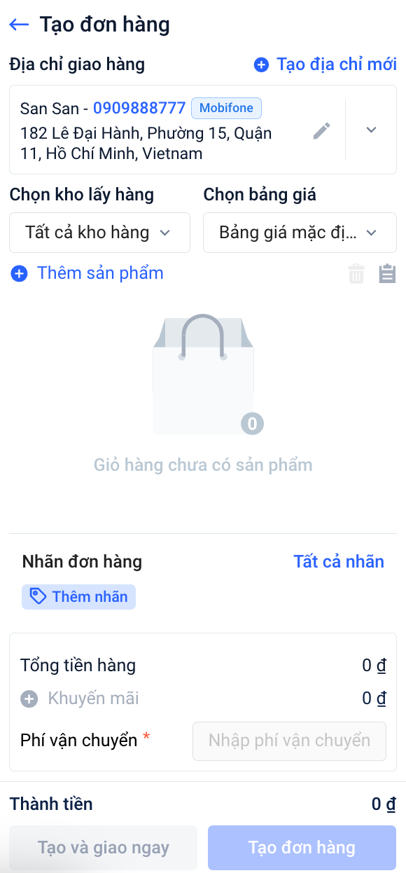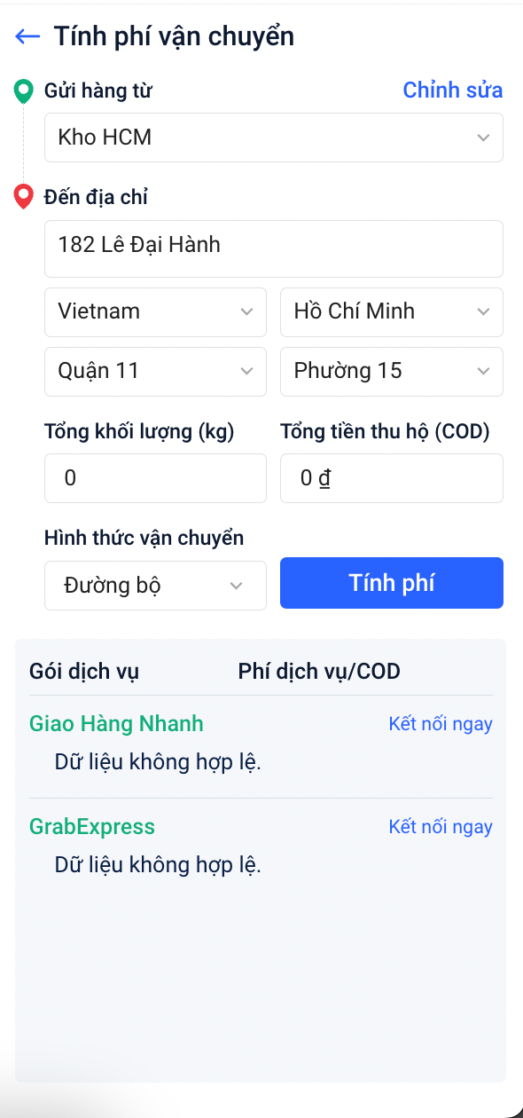 Bạn chỉ cần lựa chọn kho gửi hàng, nhập địa chỉ giao hàng và các thông tin còn lại → Bấm Tính phí. Sau đó hệ thống sẽ liệt kê danh sách các mức giá ship của các đơn vị vận chuyển → Bạn chỉ cần báo giá cho khách và nếu khách đồng ý thì nhấp vào nút Tạo đơn bên cạnh phí ship đó là đã hoàn thành.