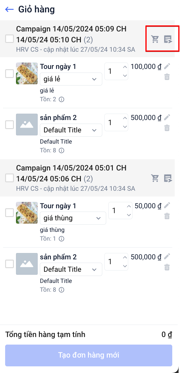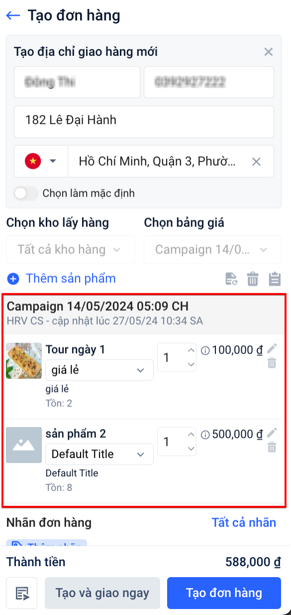 c. Chọn nhiều sản phẩm từ nhiều chiến dịch để tạo đơn mới