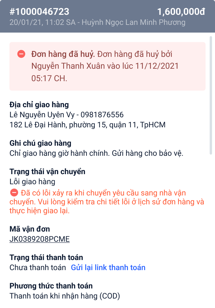 - Đối với các đơn hàng bị hủy, bạn có thể theo dõi được nhân viên đã thực hiện hủy đơn.