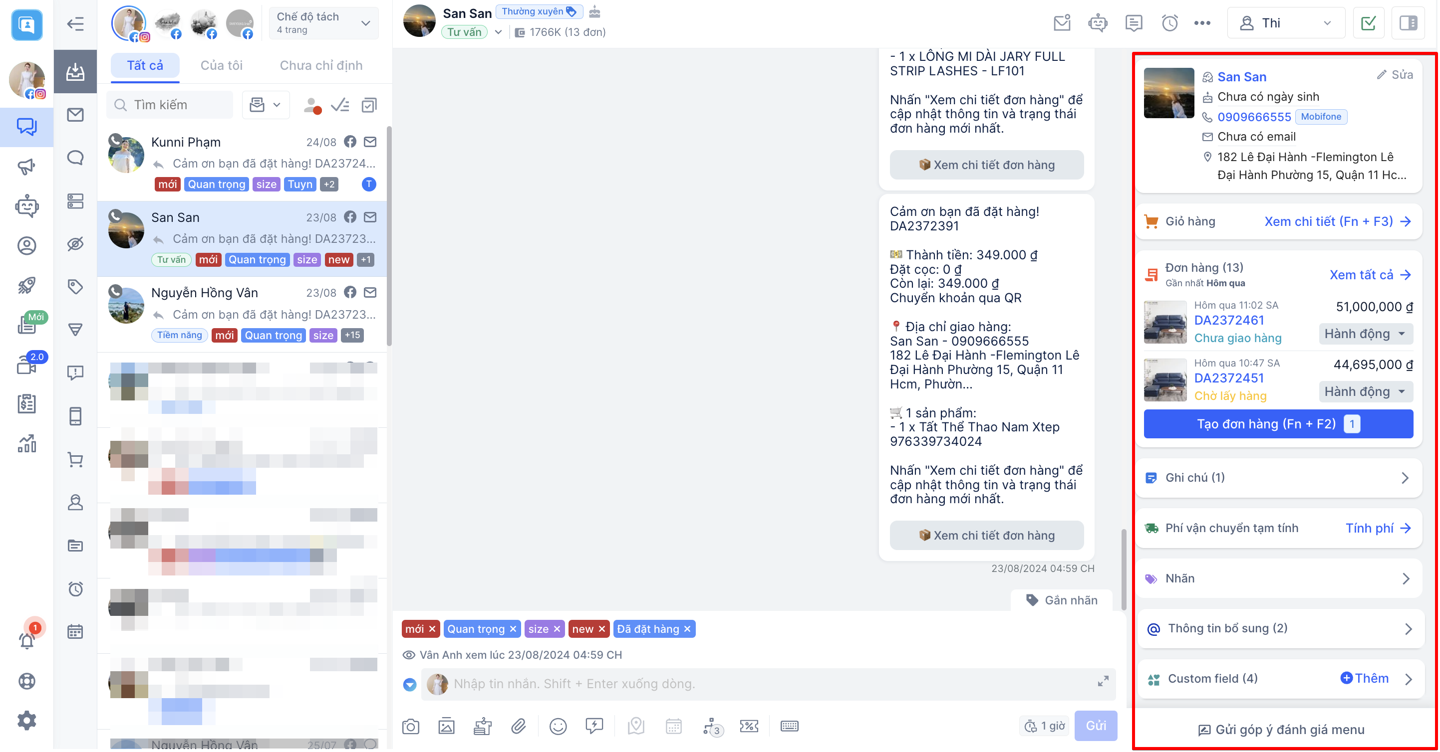 Các dữ liệu thông tin của khách hàng sẽ được hiển thị ngay trong khung Custom field để người bán có thể tiện theo dõi và cập nhật thông tin. Chọn "Thêm" để lọc thêm các trường thông tin của khách hàng.