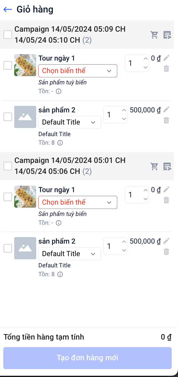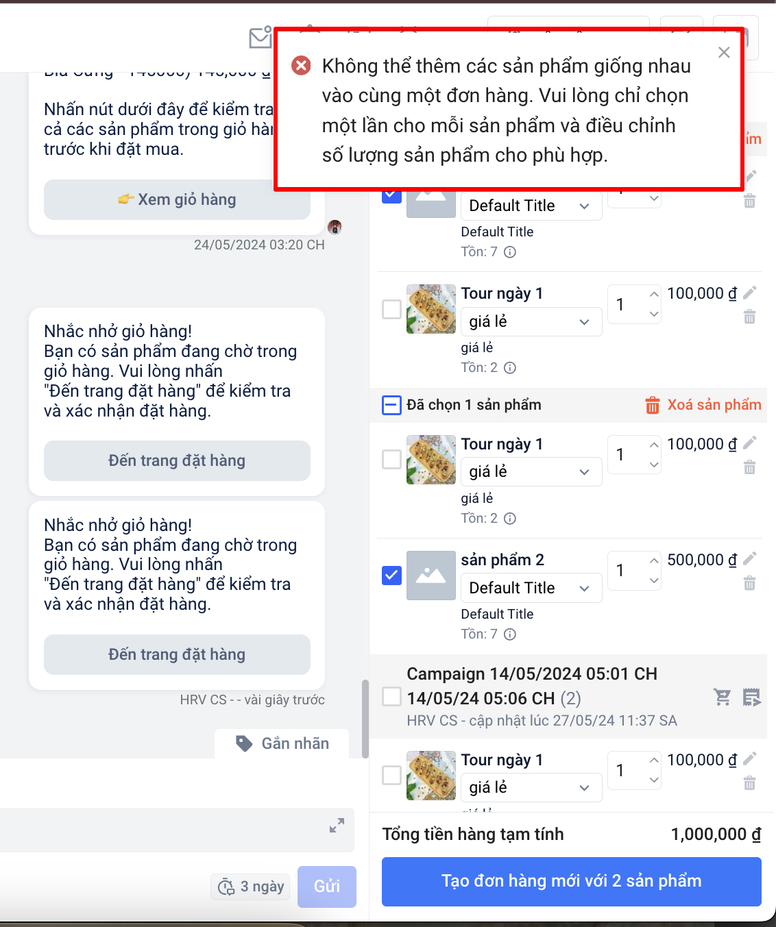 - Khi tạo đơn hàng mới dựa trên các sản phẩm của các chiến dịch tại trang giỏ hàng, bạn không thể tạo đơn khi thêm các sản phẩm giống nhau vào cùng một đơn hàng.