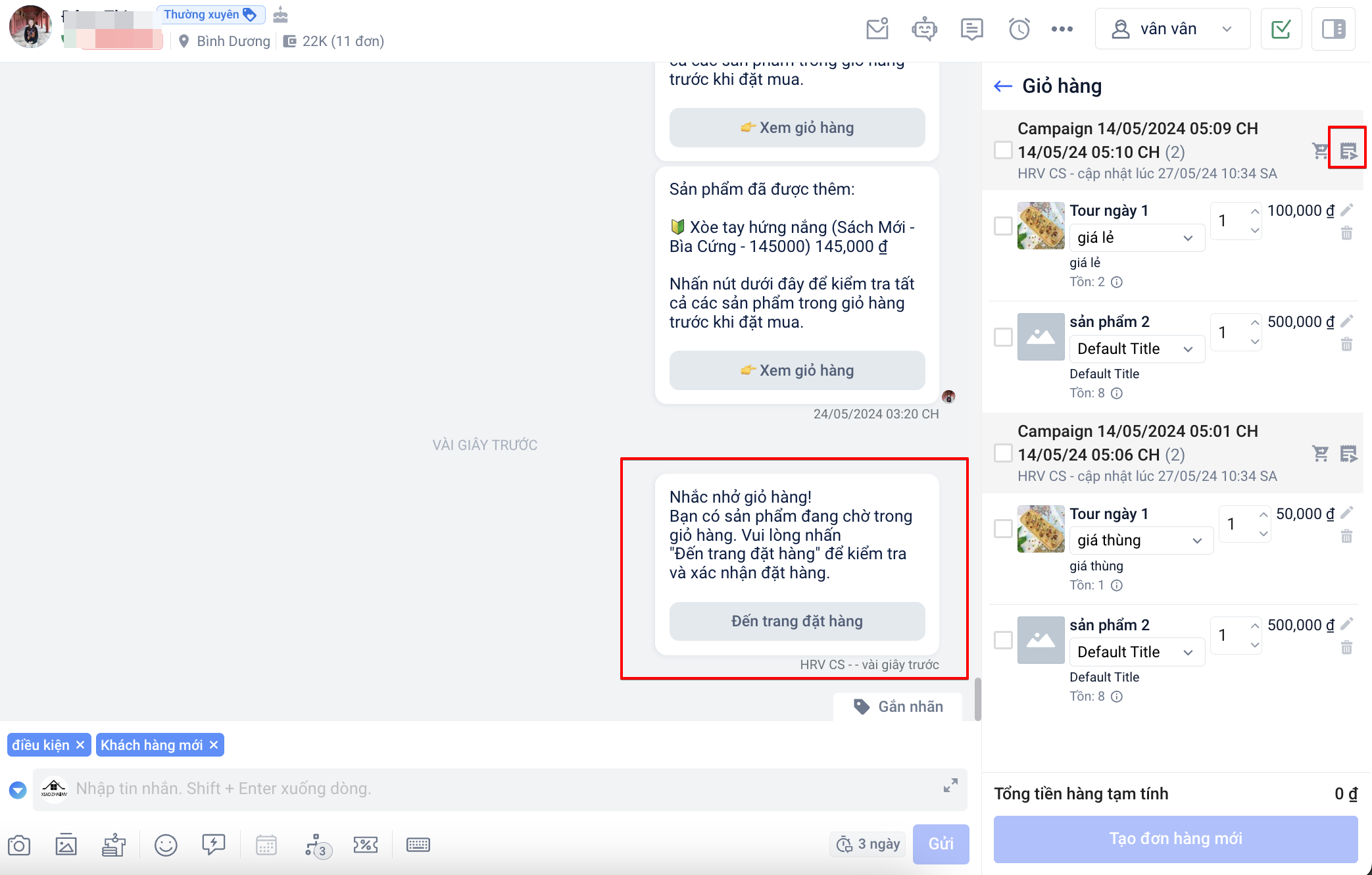 Bạn có thể chọn nhiều sản phẩm từ nhiều chiến dịch khác nhau để tạo một đơn hàng mới. Với đơn hàng mới này, khi nhấn vào nút gửi liên kết giỏ hàng tại mục tạo đơn, hệ thống sẽ tự động lưu tên giỏ hàng bằng tên Nhân viên tạo tại trang giỏ hàng.