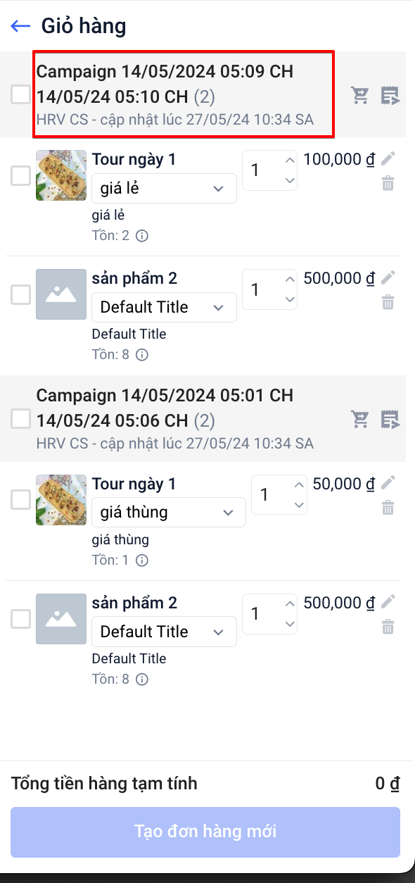 Tại trang giỏ hàng bạn sẽ theo dõi được thông tin tên chiến dịch của đơn hàng. Bên cạnh đó, với mỗi lần có sự cập nhật chỉnh sửa sản phẩm trong đơn thì hệ thống cũng sẽ hiển thị tên nhân viên thao tác.