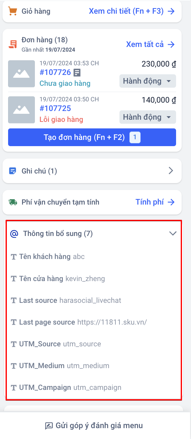 Ở mục thông tin bổ sung, các trường thông tin về khách hàng đến từ link, kênh chat hoặc chiến dịch nào sẽ được hiển thị để người bán có thể dễ dàng kiểm soát thông tin khách hàng.