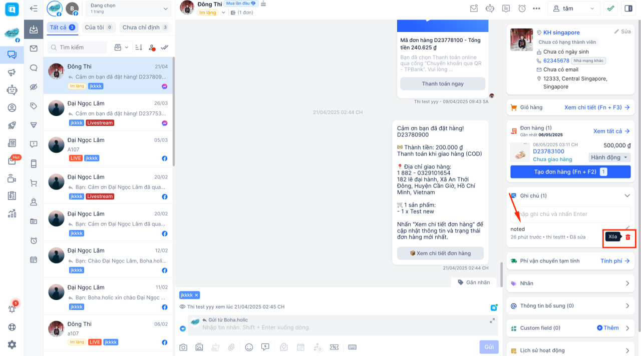 Cách chỉnh sửa/xóa ghi chú hội thoại khách hàng tại Harasocial