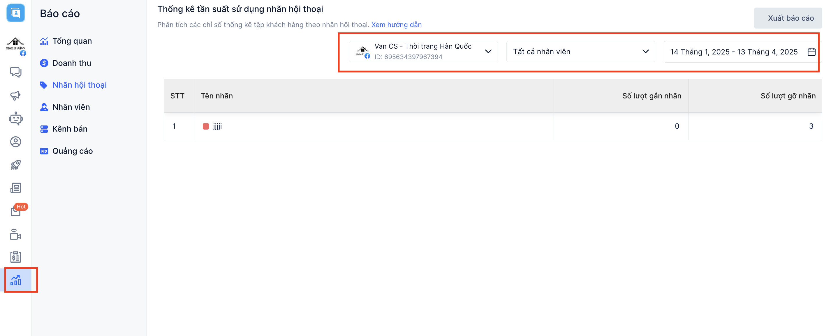 Cách 1: Xem báo cáo theo nhãn hội thoại tại Harasocial: