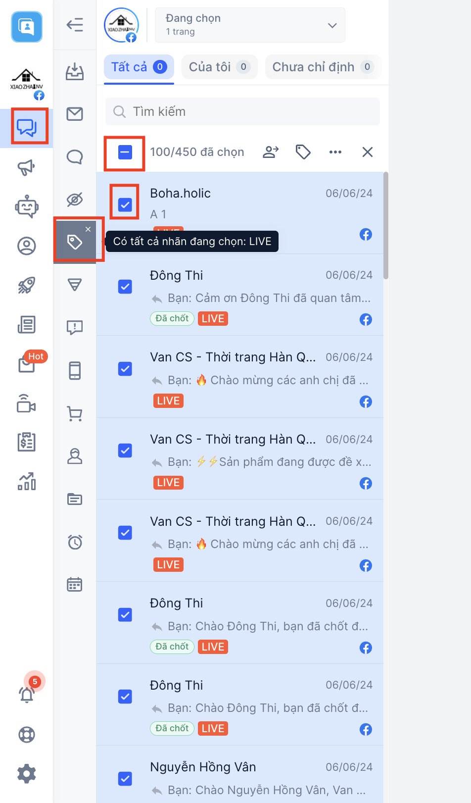 Cách 2: Nếu số lượng hội thoại chứa nhãn không nhiều, shop có thể lọc theo nhãn tại mục hội thoại Harasocial, đếm thủ công hoặc lọc nhãn xong, hover chuột vào hộit hội thoại và tick chọn hàng loạt các hội thoại: