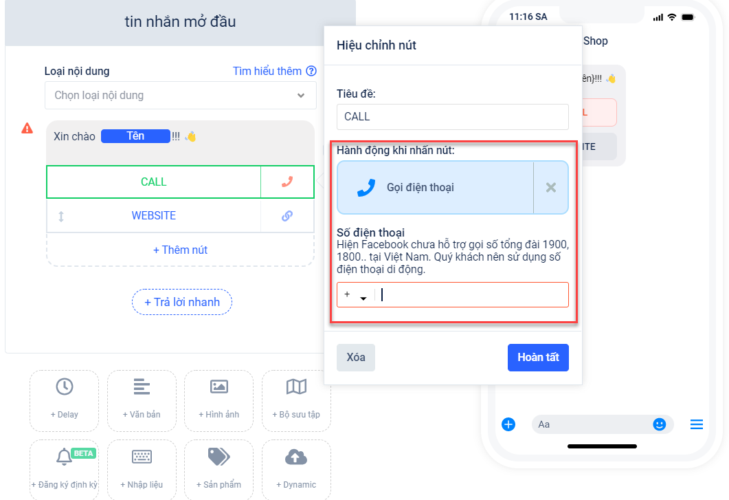 Để thao tác thiết lập được nút hành động này, bạn cần lựa chọn nút và hành động Gọi điện thoại → sau đó bạn cần nhập số điện thoại vào. Lưu ý: Hiện Facebook chưa hỗ trợ gọi số tổng đài 1900, 1800 tại Việt Nam. Bạn cần sử dụng số điện thoại di động.