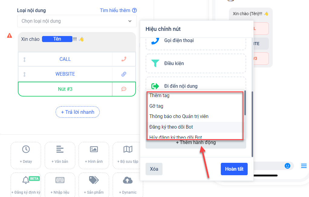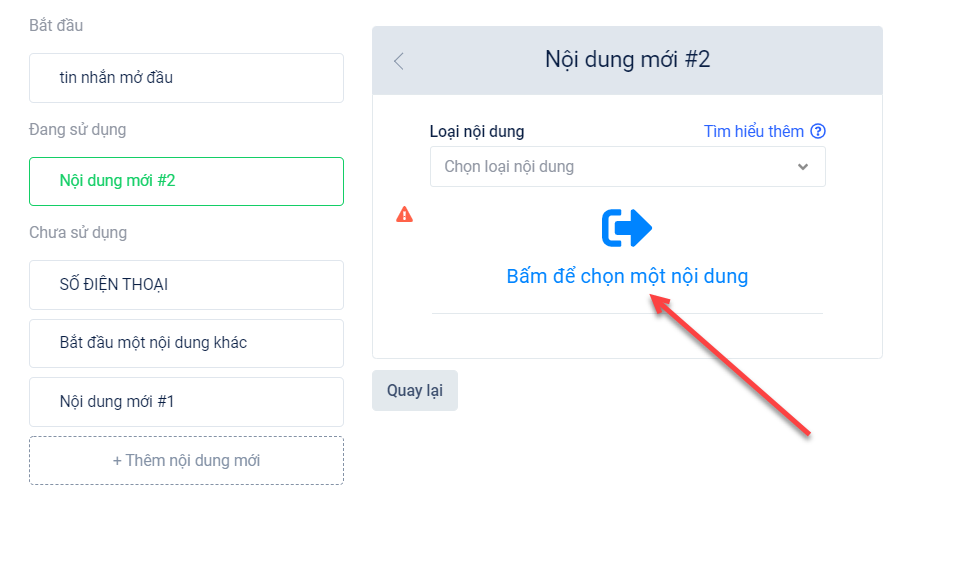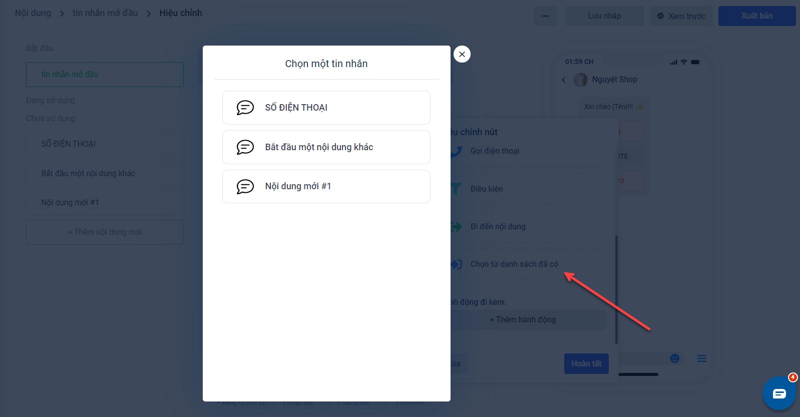 Ví dụ: Bạn thiết lập một nội dung tin nhắn bao gồm 3 nút và bạn đang ở thiết lập nút 3, khi đó bạn muốn thiết lập nội dung giống như nút 2, bạn có thể chọn hành động “Chọn từ danh sách đã có” → Khi đó hệ thống sẽ hiển thị danh sách để bạn lựa chọn