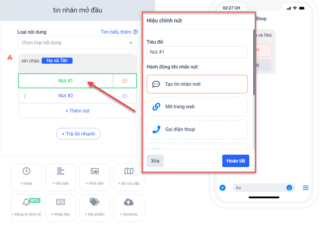 Với tính năng “Tạo tin nhắn mới”, khi khách hàng nhấn vào nút đã được thiết lập nội dung, kịch bản sẽ tự động đưa ra tin nhắn mà bạn đã tạo.