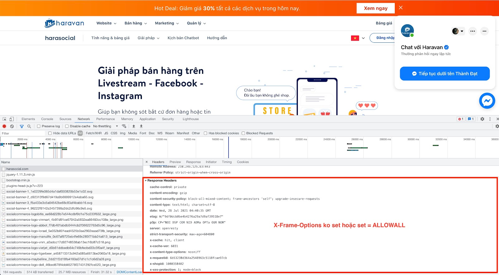 Để kiểm tra X-Frame-Option đã mở hay chưa thì bạn dùng Chrome, nhấn F12 và chọn Network, sau đó click vào URL bên cột trái rồi nhìn hình bên dưới.