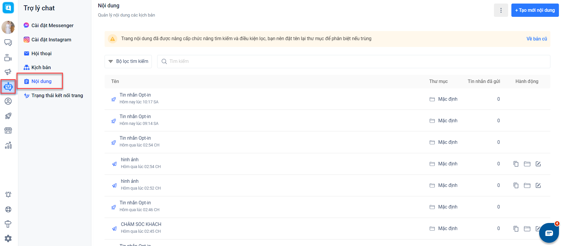 Khi nhấn vào tính năng này, hệ thống sẽ điều hướng khách hàng đến một danh sách tổng hợp các nội dung tin nhắn đã được tạo trước đó để bạn có thể lựa chọn. Danh sách tổng hợp này sẽ được lưu lại trong thư mục nội dung tại Trợ lý chat.