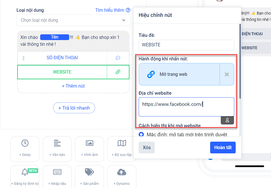 Bạn cần nhấp vào Nút và lựa chọn hành động Mở trang web → Sau đó bạn nhập link website vào → Bạn có thể lựa chọn cách thức hiển thị và kích thước webview.