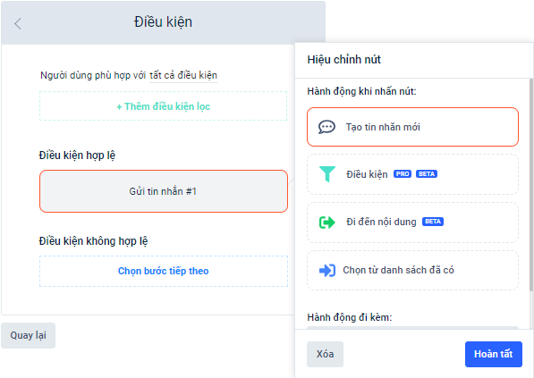 Đầu tiên, bạn nhấn vào Nút là lựa chọn chức năng Điều kiện. Sau đó bạn sẽ được chuyển đến trang thiết lập điều kiện → Bạn cần lựa chọn cách thức lọc và điều kiện lọc dựa trên các trường thông tin.
