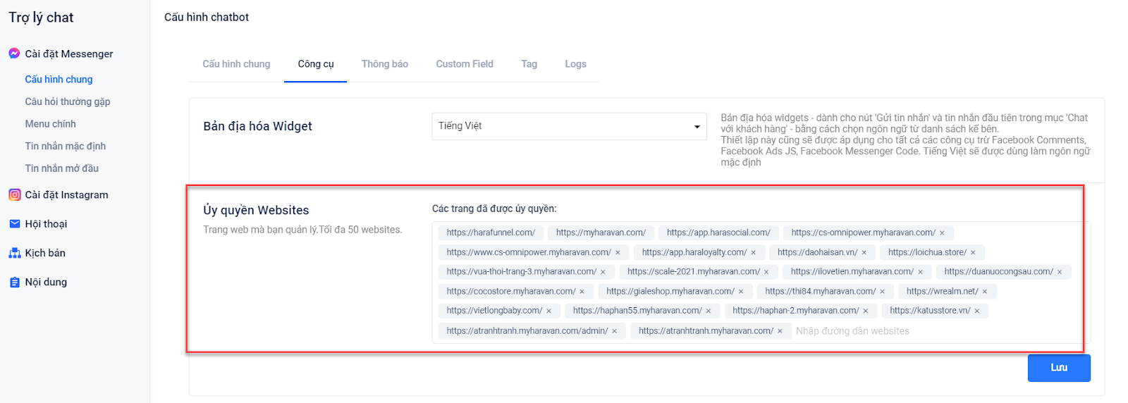 Với hình thức hiển thị Webview, bạn cần phải thiết lập ủy quyền website tại mục Cấu hình chung trong Cài đặt Messenger.