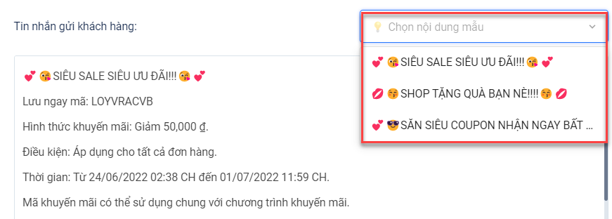 - Hiệu chỉnh nội dung thông báo mã khuyến mãi: Bạn có thể chỉnh sửa nội dung thông báo mã khuyến mãi theo mong muốn. Hoặc Harasocial hỗ trợ cho người dùng những nội dung mẫu để có thể lựa chọn phù hợp với nội dung khuyến mãi.