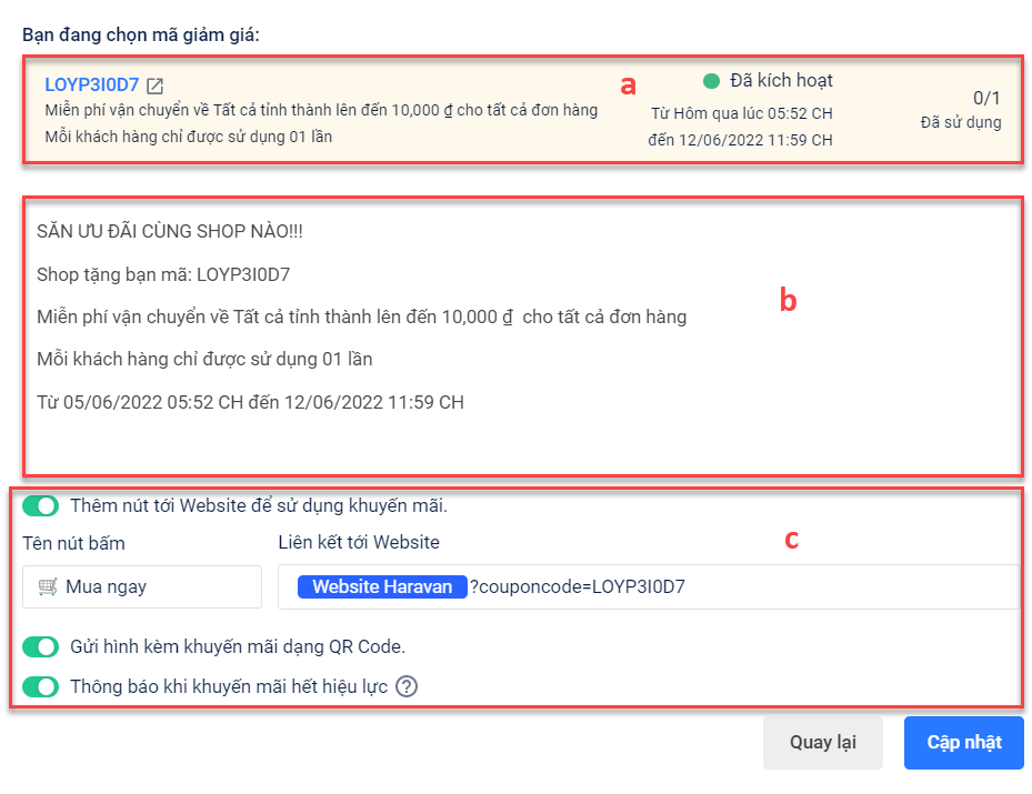 Bạn có thể xem chi tiết hướng dẫn cách tạo mã khuyến mãi từ trang quản trị MyHaravan tại đây.