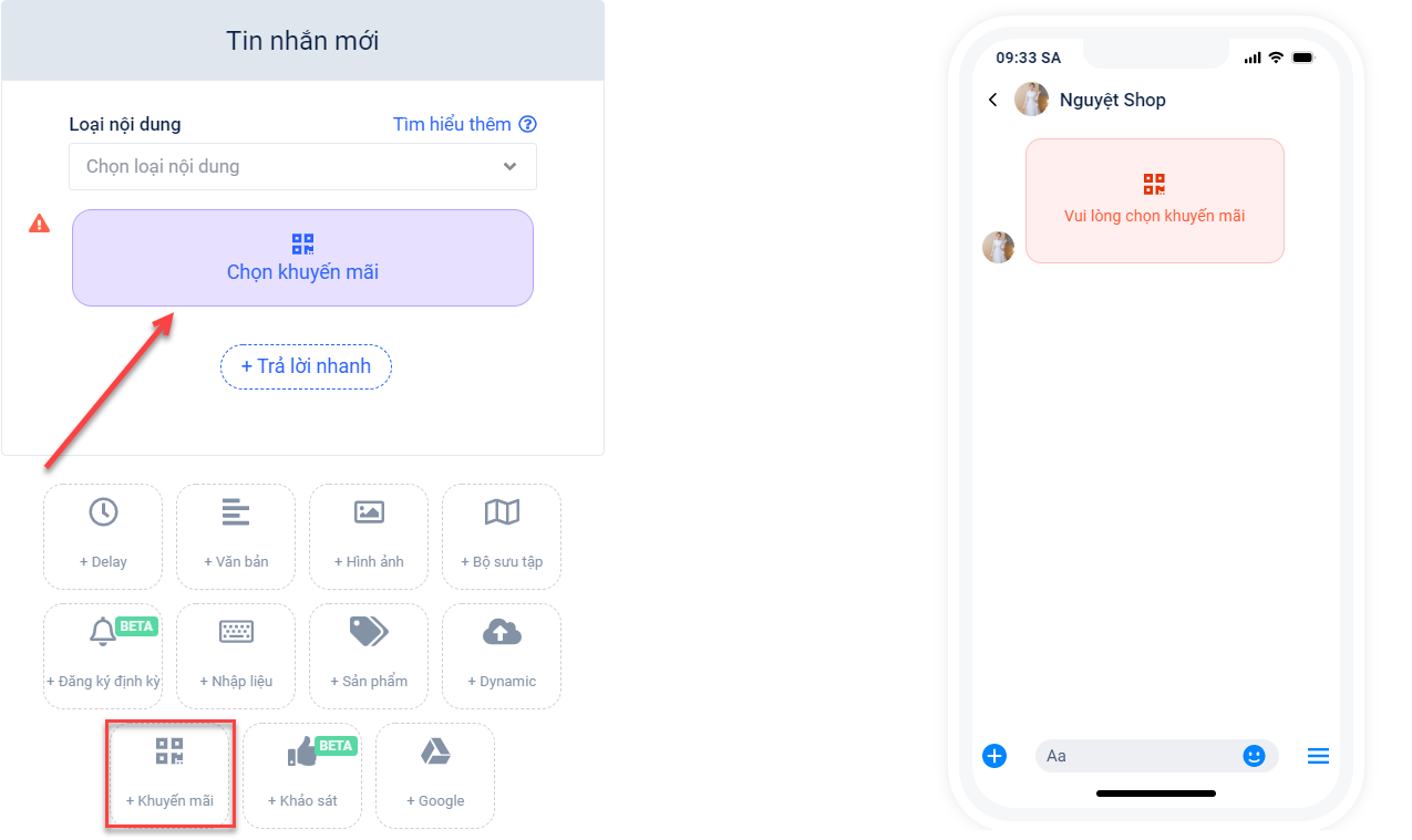 - Bước 1: Truy cập vào mục thiết lập nội dung kịch bản → Chọn khối tính năng “+ Khuyến mãi” → Bấm Chọn khuyến mãi.
