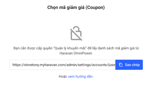 Lưu ý: Bạn cần được cấp quyền “Quản lý khuyến mãi” để lựa chọn mã giảm giá từ Haravan trang quản trị MyHaravan. Nếu chưa được cấp quyền, hệ thống sẽ hiển thị thông báo dưới đây: