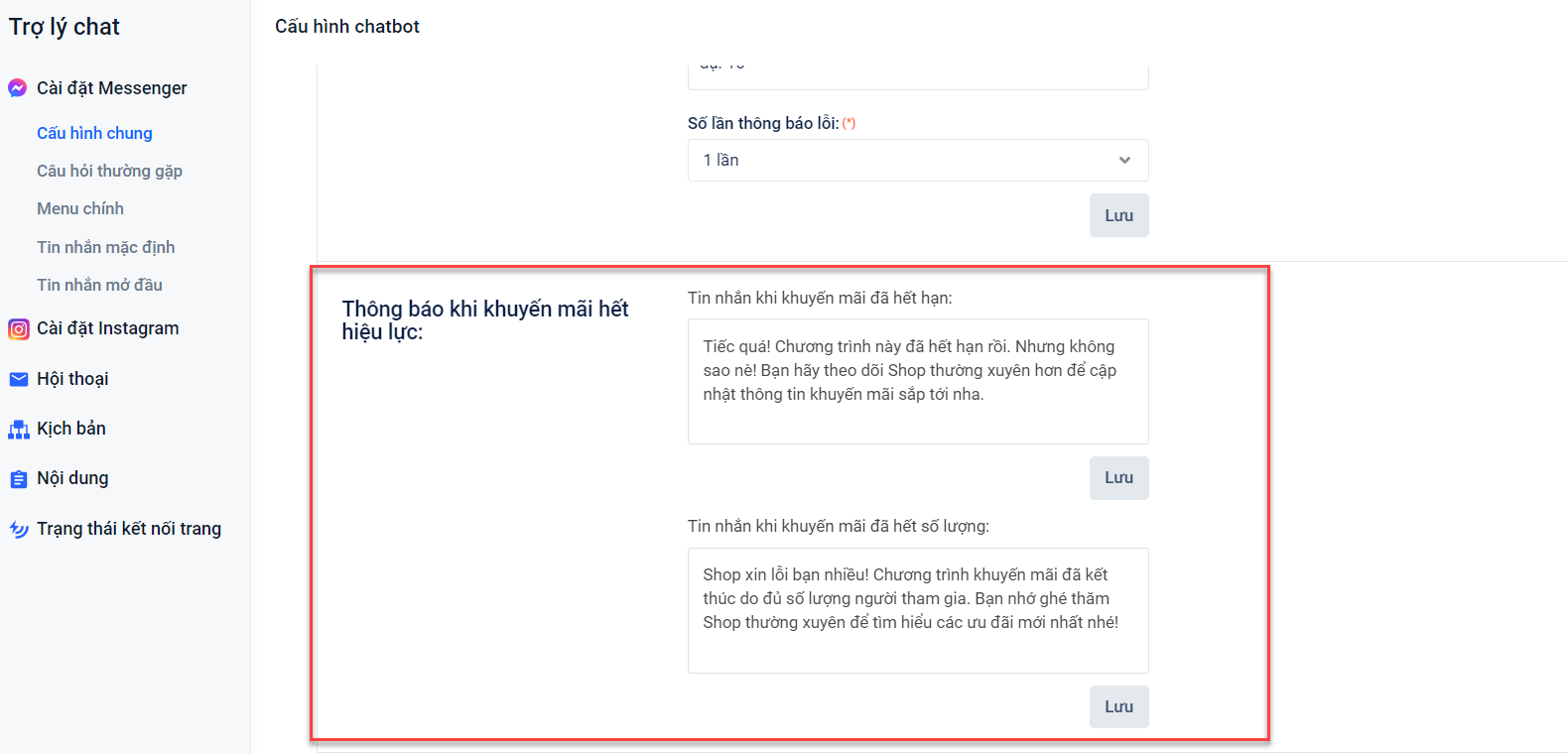 - Thông báo khuyến mãi khi hết hiệu lực: Khi mã đã hết thời gian hiệu lực hoặc hết số lượng sử dụng, trường hợp khách hàng vẫn nhận được kịch bản và áp dụng mã, hệ thống sẽ hiển thị thông báo. Nội dung thông báo bạn có thể chỉnh sửa tại Trợ lý chat → Cấu hình chung.
