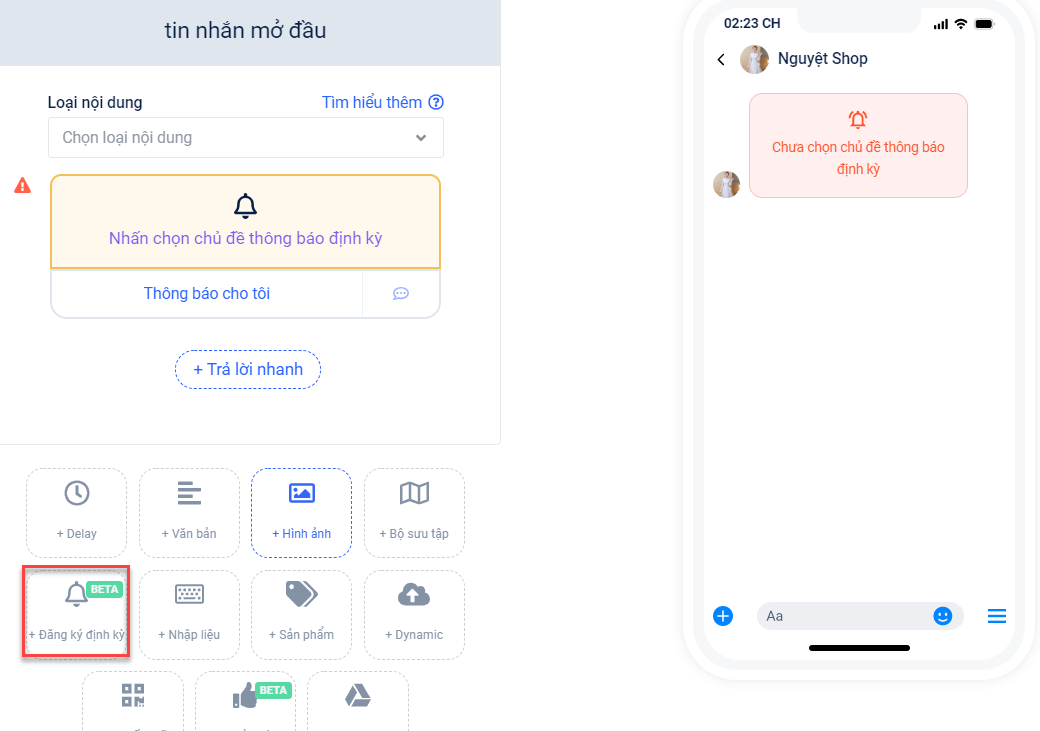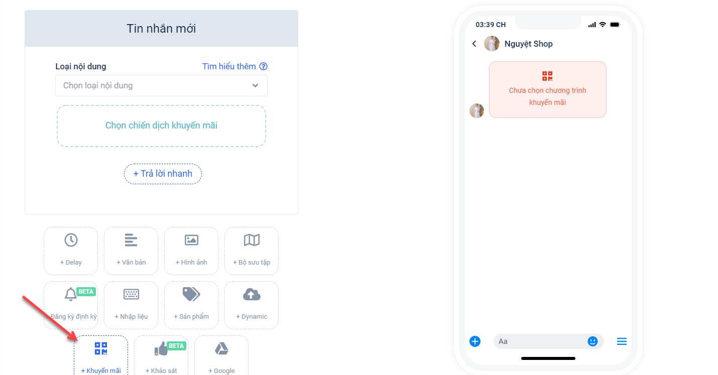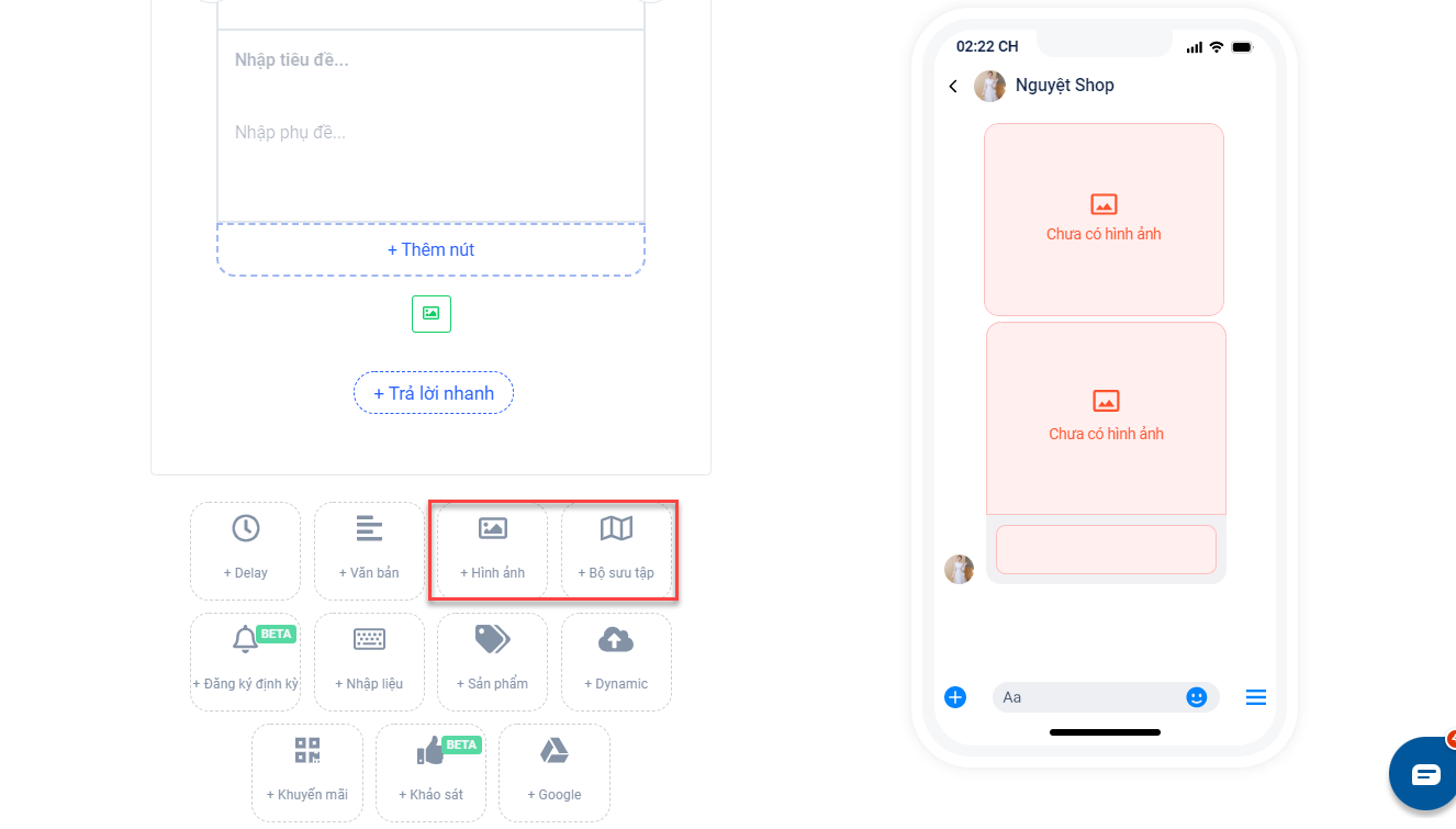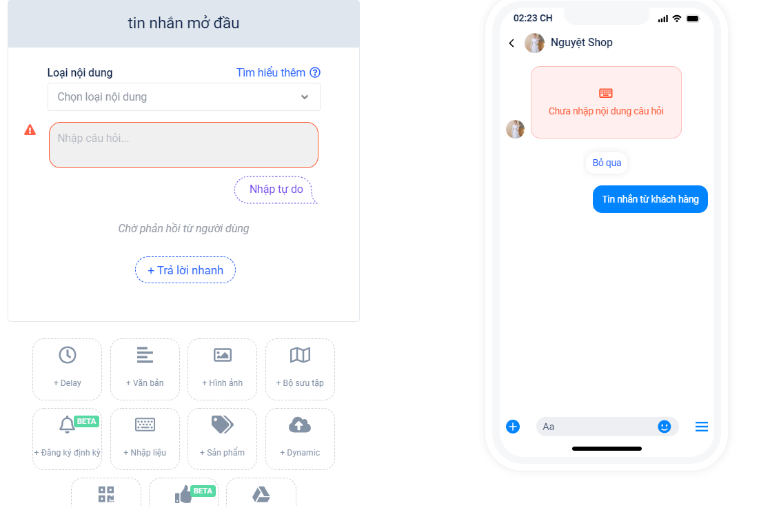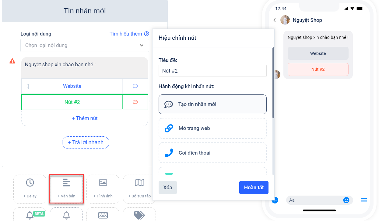 Đây chính là khối tính năng thông dụng nhất trong 1 kịch bản, tại đây bạn có thể tạo nội dung đi kèm với những nút hiệu chỉnh nhằm điều chỉnh khách hàng đến một nội dung khác hoặc đính kèm các hành động mà mình muốn.