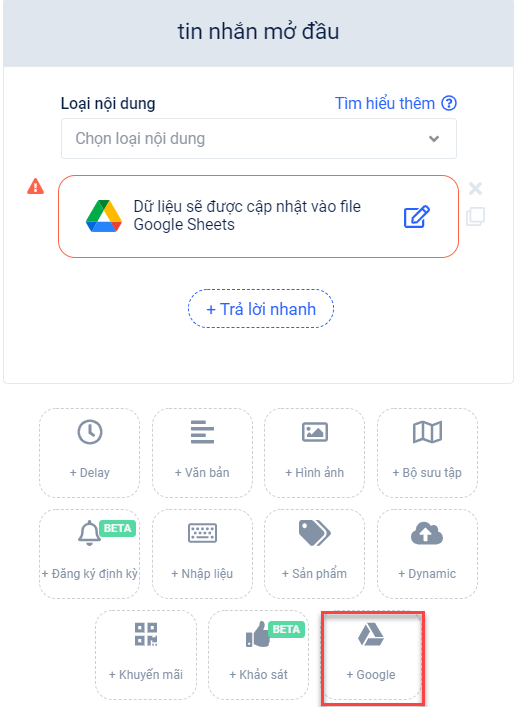Với khối tính năng Google sheet này bạn có thể kết hợp với tính năng Nhập liệu nhằm thu thập các trường thông tin của khách hàng như Email, số điện thoại tên; từ đó hệ thống sẽ tự động xuất các dữ liệu thông tin đó để đẩy sang file google sheet mà bạn đã thiết lập.