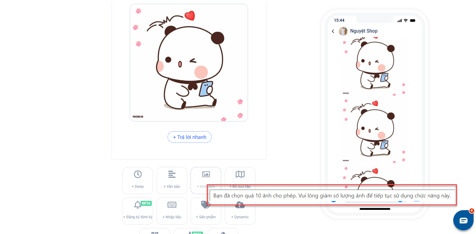- Bạn chỉ có thể chọn tối đa 10 hình ảnh trong 1 nội dung văn bản. Nếu bạn chọn quá giới hạn cho phép, khối tính năng hình ảnh sẽ bị ẩn và hiển thị thông báo như sau: