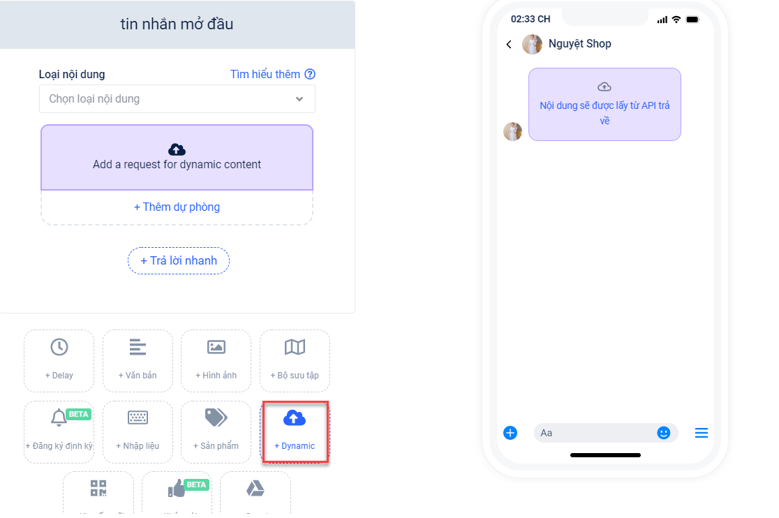 Khối Dynamic này cho phép bạn nhận một nội dung được tạo trên máy chủ từ xa (remote server) và sau đó gửi nó đến cho người đăng ký chatbot của bạn.