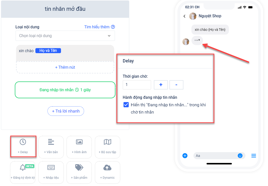 Chức năng của khối tính năng này chính là tạo ra một khoảng thời gian hoãn ngắn tầm vài giây và hiện biểu tượng đang nhập tin nhắn. Điều này sẽ cho khách hàng cảm giác rằng họ đang được chat với 1 nhân viên thực tế, nhu cầu của họ đang được quan tâm.