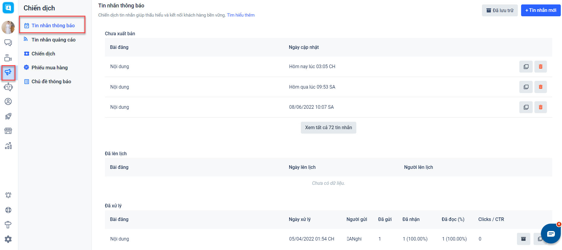 - Chưa sử dụng: tất cả các tin nhắn chưa được kết nối với bất kỳ nút nào.