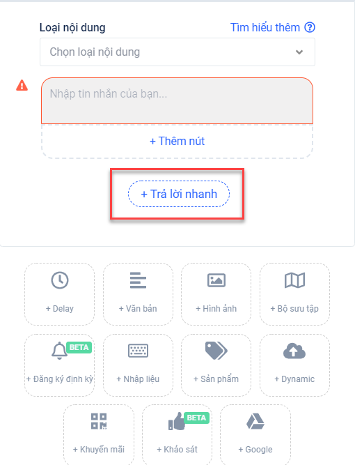 Với nút “trả lời nhanh” sẽ cung cấp cho các khách hàng có thể tương tác trực tiếp với kịch bản tự động của bạn dễ dàng hơn, điều hướng được khách hàng đến với nội dung chính xác hơn.