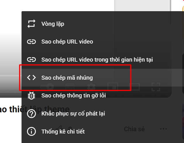 Tại Video youtube click chuột phải chọn Sao chép mã nhúng: